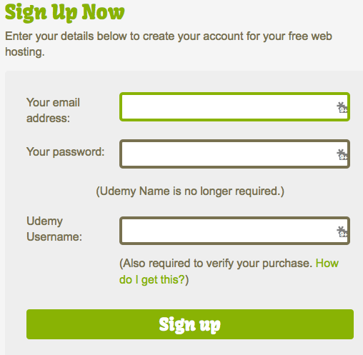 You can then sign up using your e-mail address, create a password and link your Udemy account to your Eco Web Hosting account using your Udemy username.