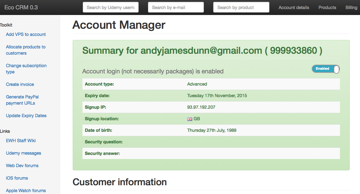 Rob had always managed Eco Web Hosting through the customer control panel and directly in the back end database, but there’s only so long a business can grow without an admin system to manage all the data.